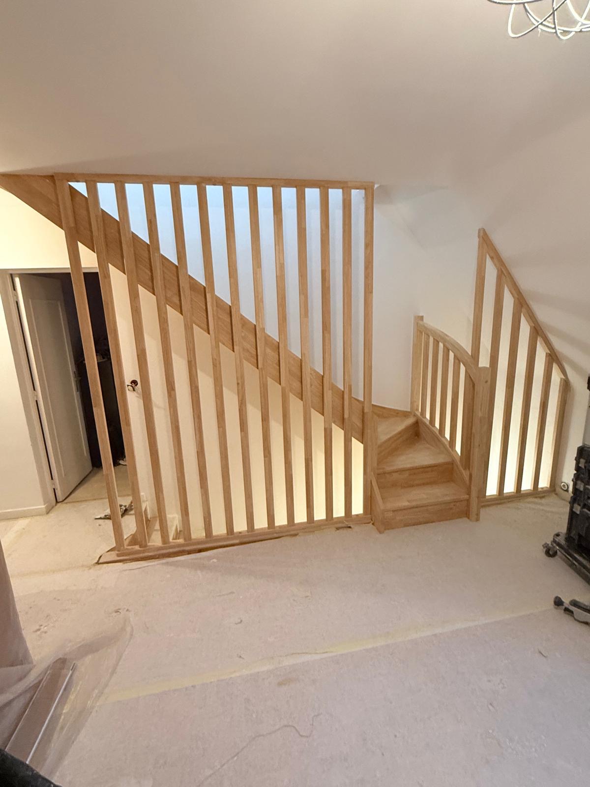 Le départ d’escalier est complété par une marche palière et un garde-corps intérieur assorti, pour une continuité esthétique entre l’escalier et la zone mezzanine/étage. Les assemblages sont réalisés avec soin afin d’obtenir un alignement régulier, une bonne rigidité et une finition propre.